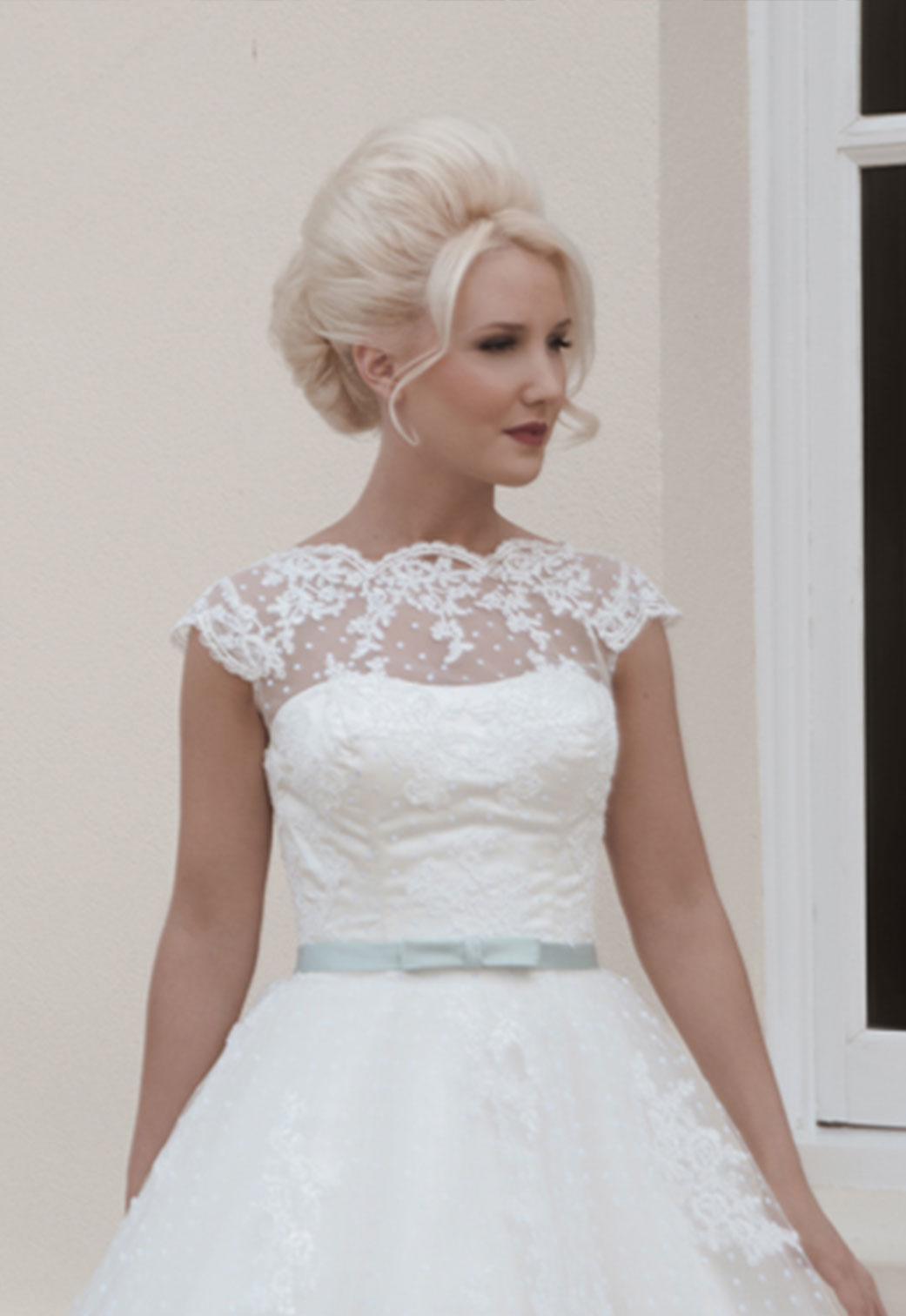 Claire is a divine spotty and lace short calf length wedding dress with illusion spotty neckline and scallop edge trim in French corded lace. Beautiful lowered back detail and teamed with a duck egg blue bow belt.